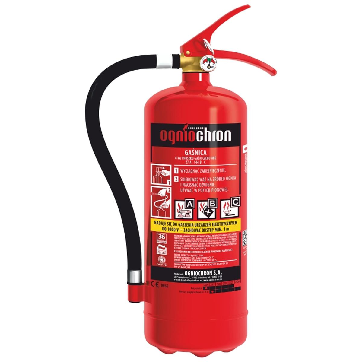 Gaśnica proszkowa 4 kg zaprojektowana dla zabezpieczenia obiektów użyteczności publicznej ,pomieszczeń biurowych, produkcyjnych, magazynów, garaży, a także domów i mieszkań prywatnych. Doskonale sprawdza się w transporcie samochodowym, kolejowym i wodnym. Znajdzie również zastosowanie jako gaśnica do kotłowni lub garażu . Łatwa w obsłudze, zapewnia szybkie i skuteczne gaszenie. Zawór skonstruowany tak, aby umożliwić czasowe przerwanie gaszenia, odcinający ze wskazaniem ciśnienia. Zbiornik nie podlega kontrolnym badaniom UDT. Możliwość wielokrotnego napełniania. Zbiornik pokryty poliestrową farbą odporną na promieniowanie UV, wewnątrz powłoka antykorozyjna. Nadaje się do gaszenia urządzeń elektrycznych do 1000V. Skuteczność gaszenia 27A 144B C, czas działania min. 15 s. Zakres temperatur stosowania -30 OC – +60 OC. Zgodna z ISO 9001. Spełnia wymagania normy europejskiej EN3 oraz Dyrektywy bezpieczeństwa PED 2014/68/UE. Produkt polski.
