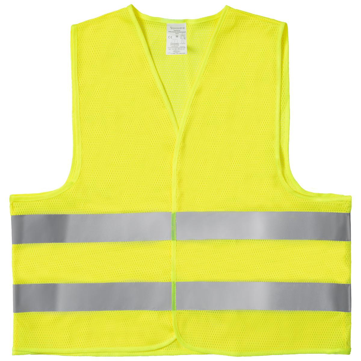 Kamizelka ostrzegawcza wykonana w 100% z poliestrowej dzianiny siatkowej o gramaturze 120 g/m², posiada dwa pasy odblaskowe dookoła korpusu. Zapinana na rzep. Kat. II Certyfikat UE CE, zgodność z normą EN ISO 20471:2013