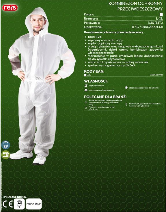 Kombinezon ochronny przeciwdeszczowy. 100% EVA zapinany na suwak i napy kaptur odpinany na napy brzegi rękawów oraz nogawek wykończone gumkami ściągającymi, dzięki czemu kombinezon zapewnia większą szczelność marszczenie w pasie umożliwia lepsze dopasowanie się do sylwetki użytkownika każda sztuka pakowana w osobny woreczek spełnia wymagania normy EN343
