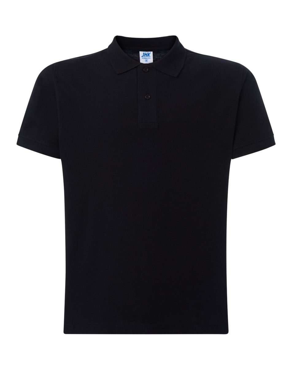 Polo męskie z krótkim rękawem. Zapinane na dwa guziki. Kołnierzyk i rękawy wykończone dzianiną 1×1. Boczne rozcięcia. 100% stabilizowana bawełna czesankowa pique.