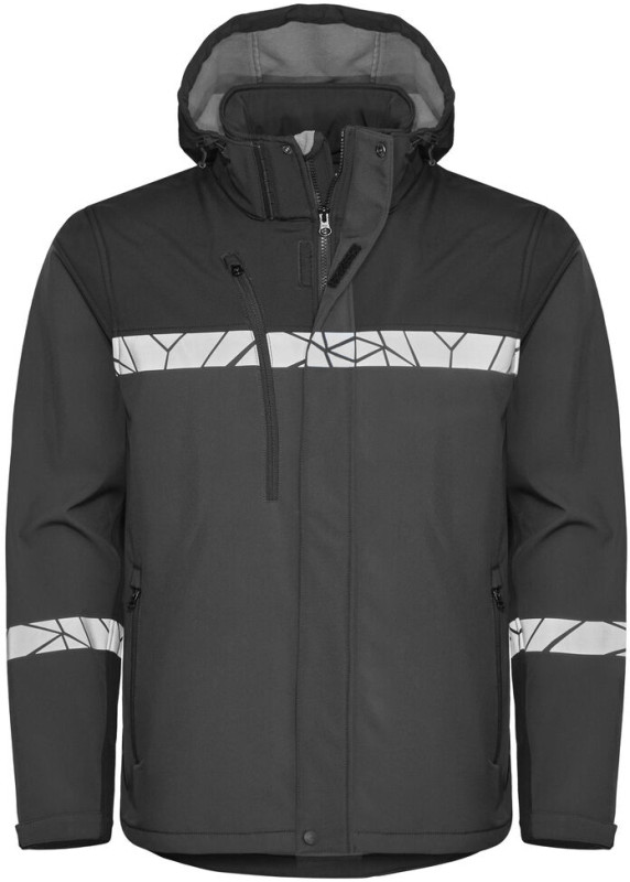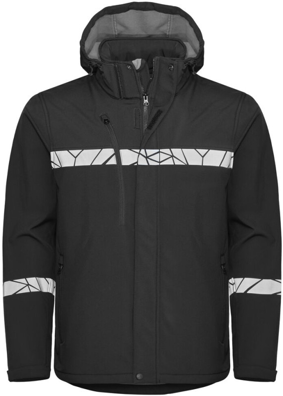 Funkcyjna kurtka typu softshell, odporna na wiatr i wodę. Zamek z przodu zabezpieczony klapą, aby zapobiec przeciągom oraz przeciekom wody. Kieszeń na piersi po prawej stronie z wewnętrznym uchwytem do przypięcia identyfikatora, a także kieszenie po bokach z zamkiem błyskawicznym. Otwarte kieszenie wewnętrzne. Wydłużony tył. Odpinany kaptur, regulowany sznurkiem. Regulowane mankiety na rzepy oraz regulowany pas ze sznurkiem. Kieszonka na metkę w wewnętrznej lewej szwie.