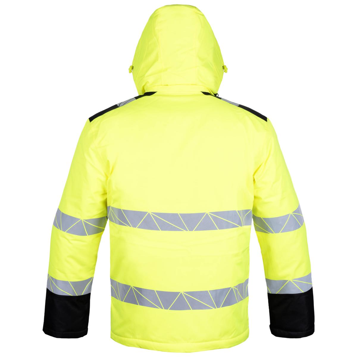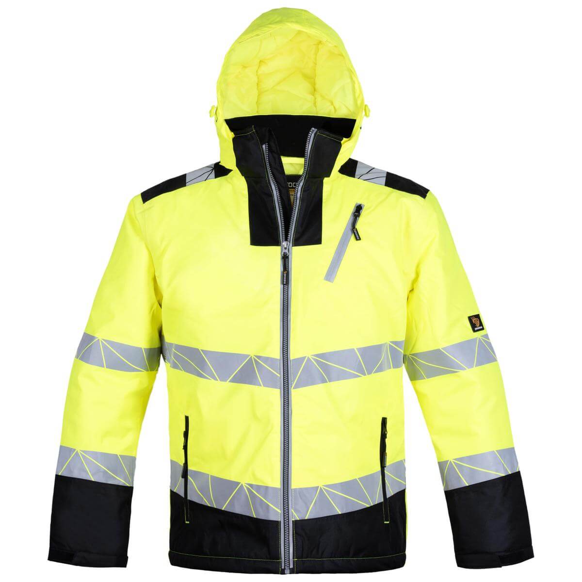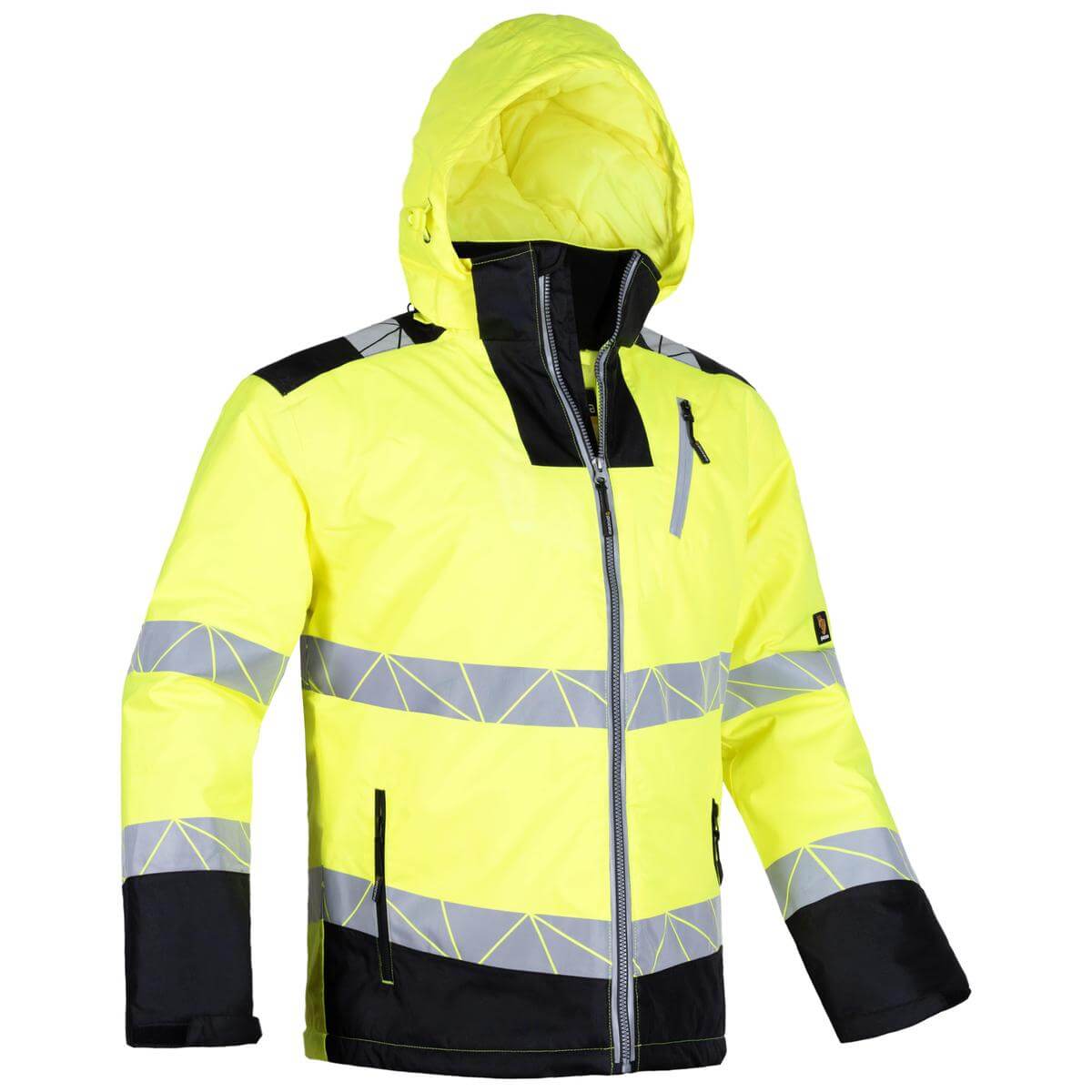 Kurtka softshell (100% poliester) w klasie II widzialności, w kolorze neonowo żółtym z czarnymi elementami w dole rękawów, w dolnej części przodów, stójce oraz na barkach. Kieszenie boczne zapinane na zamek. Kieszeń barkowa zapinana na zamek. Odpinany kaptur. Obwód rękawów regulowany na rzep, zapewniając lepsze dopasowanie. Drukowane odblaskowe pasy na przodzie, tyle, na barkach oraz rękawach. Produkt spełnia wymogi normy PN-EN ISO 13688:2013 oraz EN ISO 20471:2013+A1:2016. Pakowanie: 1/10 karton.