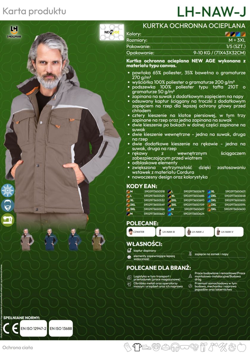 Kurtka ochronna ocieplana NEW AGE wykonana z materiału typu canvas. powłoka 65% poliester, 35% bawełna o gramaturze 270 g/m² wyściółka 100% poliester o gramaturze 200 g/m² podszewka 100% poliester typu tafta 210T o gramaturze 50 g/m² zapinana na suwak z dodatkowym zapięciem na napy odsuwany kaptur ściągany na troczki z dodatkowym zapięciem na rzep dla […]
