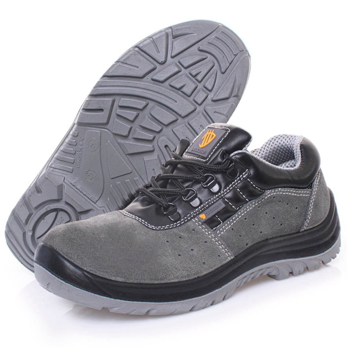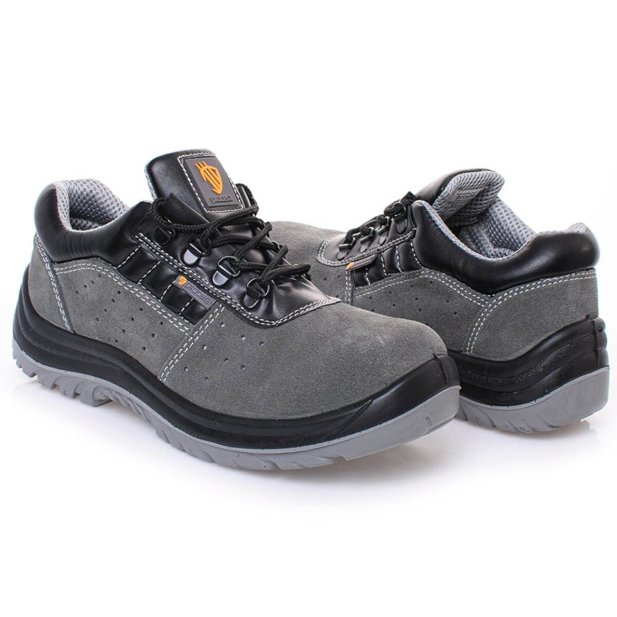 Półbuty bezpieczne RIO z metalowym podnoskiem ochronnym. Cholewka obuwia wykonana jest ze skóry zamszowej. Podeszwa z dwuwarstwowego poliuretanu PU/PU, antyelektrostatyczna. Absorpcja energii w części piętowej. Podeszwa antypoślizgowa. Wstawki z materiałów syntetycznych. Wyściółka w kolorze szarym z materiałów o właściwościach higroskopijnych. Perforacja cholewki w części bocznej zapewniająca oddychanie stopie. Głęboki protektor zapewniają wysoką stabilność obuwia i komfort chodzenia. Kategoria S1.