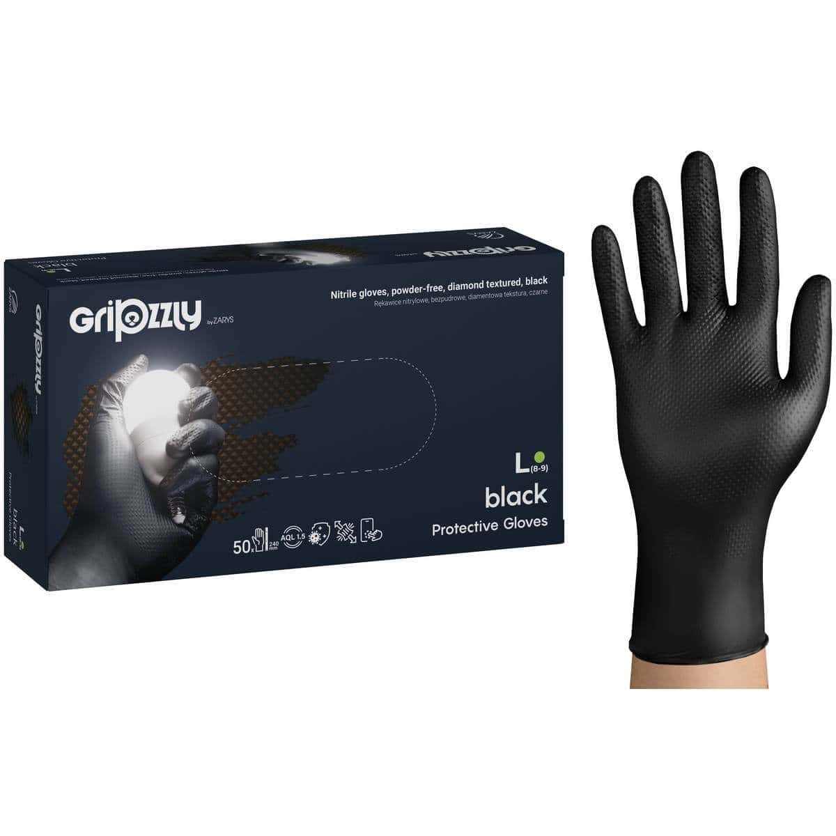 RĘKAWICE NITRYLOWE BEZPUDROWE CZARNE ZE STRUKTURĄ 50 SZT. – GRIPZZLY M-XXL
