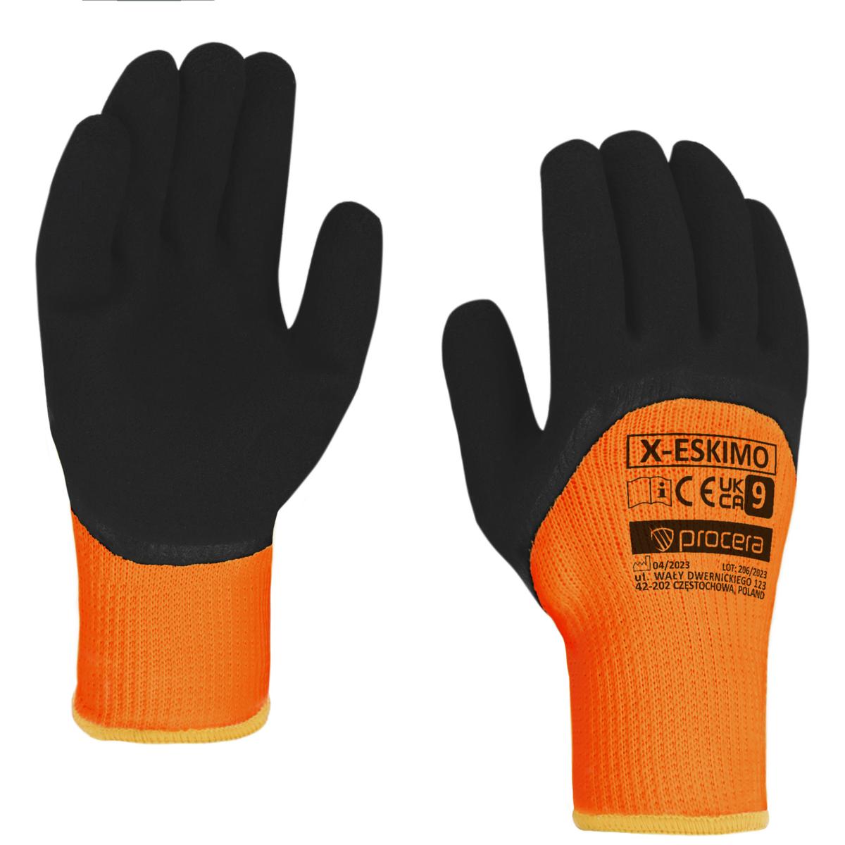 Rękawice X-ESKIMO wykonane z ocieplanej dzianiny poliestrowo bawełnianej w kolorze pomarańczowym, powlekanej pianką lateksową w części chwytnej oraz całe palce w części grzbietowej. Pianka w kolorze czarnym lub brązowym. Idealne do prac manualnych w niskich temperaturach. Bardzo dobra przyczepność. Duża wytrzymałość na ścieranie. Zakończone ściągaczem. CE EN 21420:2020. Opakowanie: karton 12/120. Kolor: pomarańczowy/brązowy.