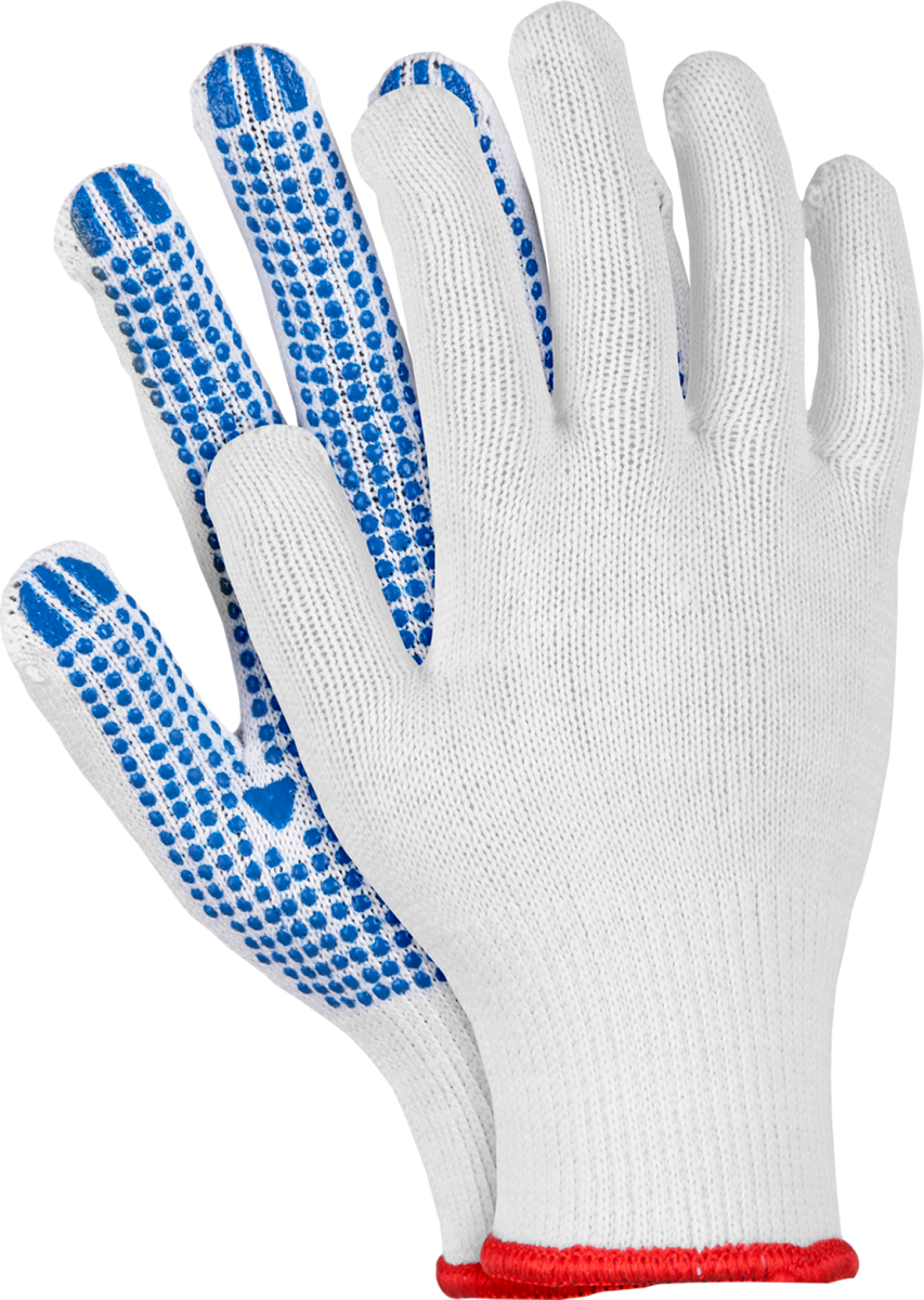 Rękawice ochronne. dzianina: 50% poliester, 50% bawełna (ścieg 10) jednostronne nakropienie z PCV na części dłonicowej zapewnia dobrą chwytność podczas przenoszenia towarów, a także zwiększa trwałość rękawicy zakończone ściągaczem połączenie poliestru z bawełną tworzy rękawice rozciągliwą, a zarazem przewiewną i bardziej wytrzymałą idealne w przemyśle transportowym sprawdzają się w budownictwie