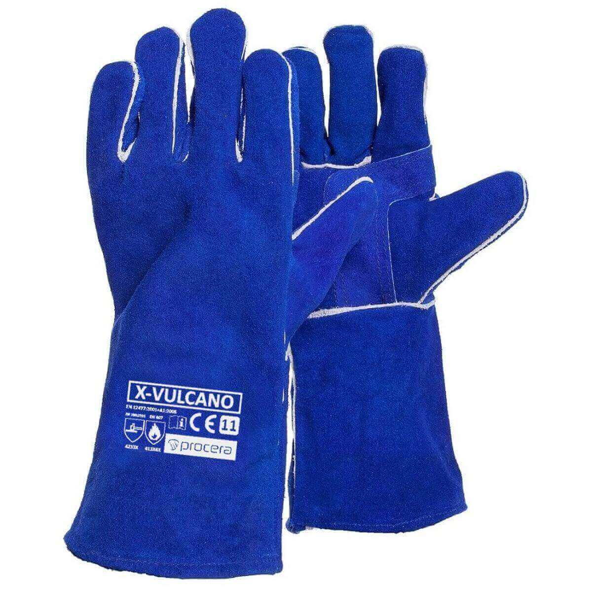 Rękawice skórzane spawalnicze X-VULCANO wykonane z dwoiny bydlęcej w kolorze niebieskim. Część chwytna z jednego kawałka skóry dwoinowej, część grzbietowa wraz z mankietem wykonana z jednego elementu skóry. W części chwytnej wzmocnienie podwójną warstwą skóry. Rękawice wykończone podszewką. Kat. II, EN388:2016, EN:407:2004, EN:12477:2001+A1:2005 Długość 35cm. Opakowanie: karton 12/72. Kolor: niebieski