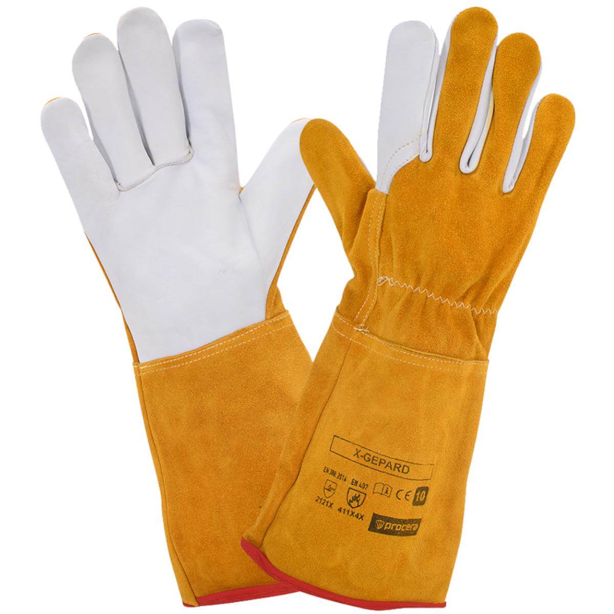 Rękawice spawalnicze X-GEPARD całoskórzane. Część chwytna całodłonicowa z jednego kawałka koziej skóry licowej, długi mankiet oraz część wierzchnia ze skóry dwoinowej w kolorze miodowym. Szyte trudnopalnymi nićmi z KEVLARU . Długość 35cm. Opakowanie: karton 12/72. Kolor: biały/miodowy. Kat. II, EN388 (poziomy odporności 2121X), EN407 (poziomy odporności 411X4X) , EN12477 (Typ B)