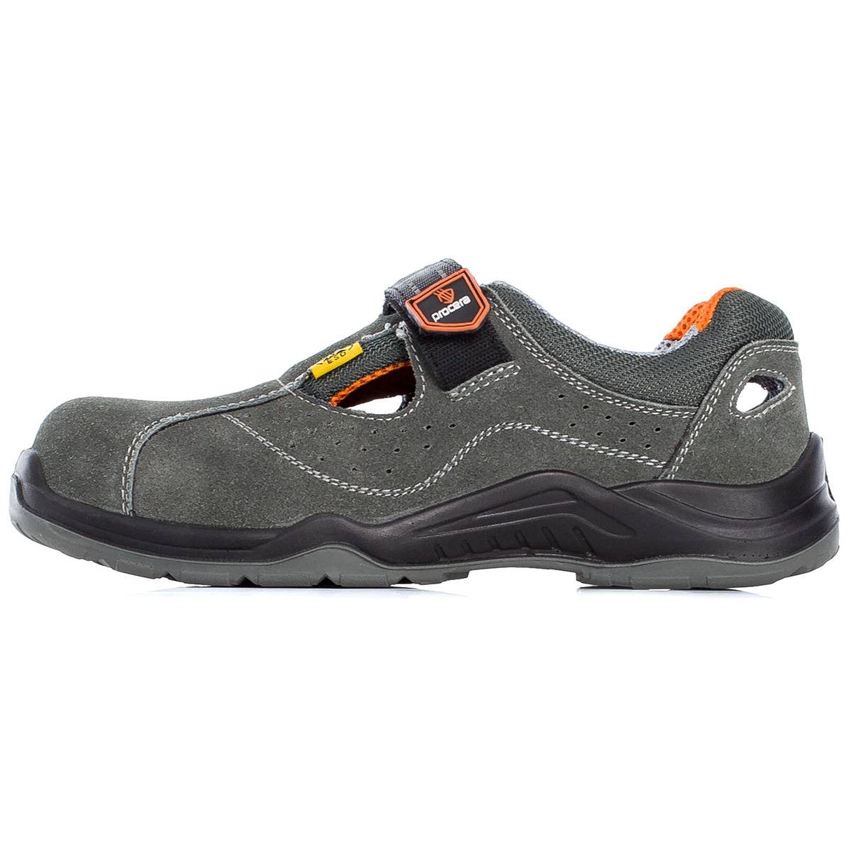Sandały bezpieczne LUPO z kompozytowym podnoskiem ochronnym o właściwościach antyelektrostatycznych ESD. Cholewka obuwia wykonana jest ze skóry welurowej w kolorze szarym. Doskonała wentylacja i właściwości higieniczne dzięki perforacjom i wysokiej przepuszczalności pary wodnej. Wyściółka z oddychającego materiału 3D Mesh. Podeszwa z dwuwarstwowego poliuretanu PU/PU w kolorze czarno/szarym, antyelektrostatyczna, antypoślizgowa, nie rysująca powierzchni, idealnie sprawdzająca się na wszelkiego rodzaju nawierzchniach. Absorpcja energii w części piętowej. Zapięcie na rzep z dodatkowym elementem odblaskowym umożliwiające pełne dopasowanie obuwia do tęgości stopy. Lekkie i wygodne. METAL FREE – brak elementów metalowych. Kategoria S1 ESD SRC