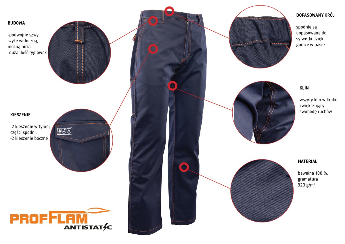- spodnie posiadają wszysty klin w kroku zwiększający swobodę ruchów oraz komfort użytkownika,