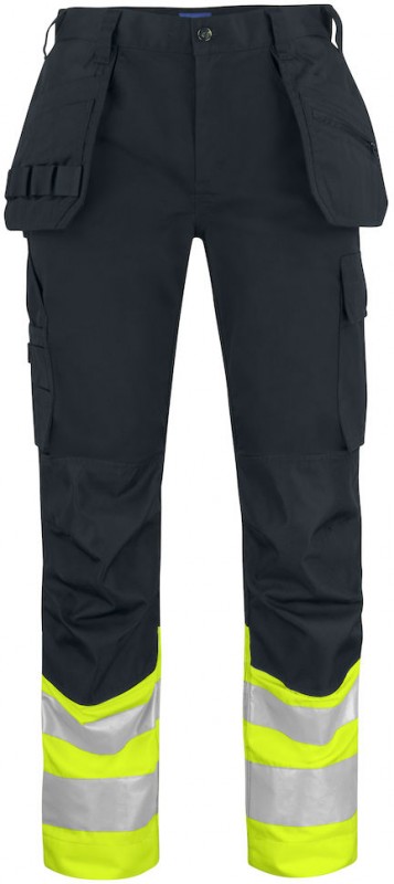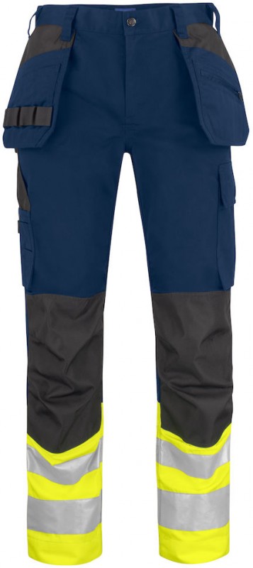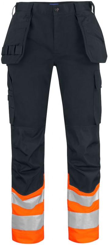 Spodnie do pasa hi viz klasy 1 wykonane z poliestru i bawełny, utrzymują swój kolor i kształt nawet po wielokrotnym praniu. Boczne kieszenie posiadają dodatkowe przedziały oraz kieszeń z zamkiem. Tylne kieszenie z patką i zamknięciem na rzep. Kieszeń na nogawce z miejscem na przechowywanie noża. Regulowane ochraniacze na kolana. Rozmiary od C42 do C64 mogą być wydłużone do 5 cm.